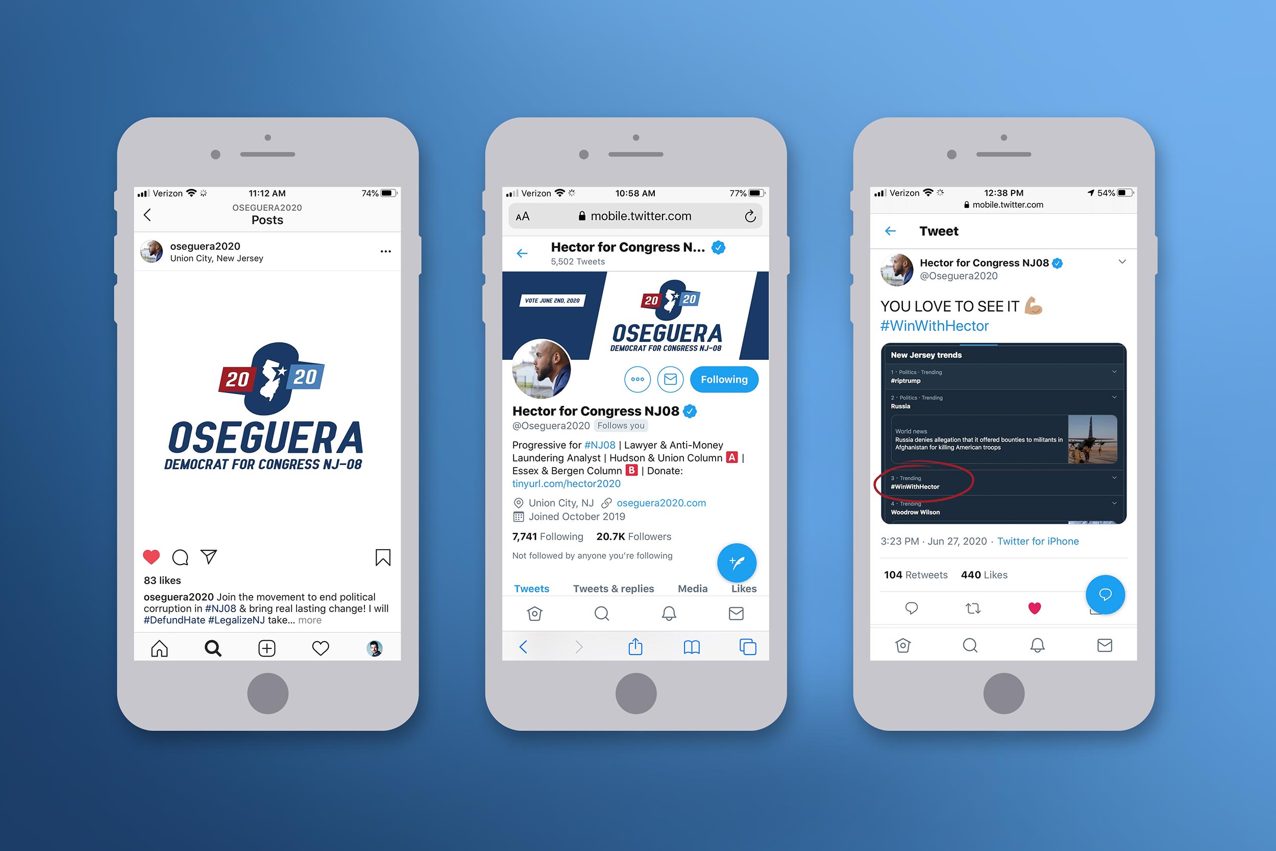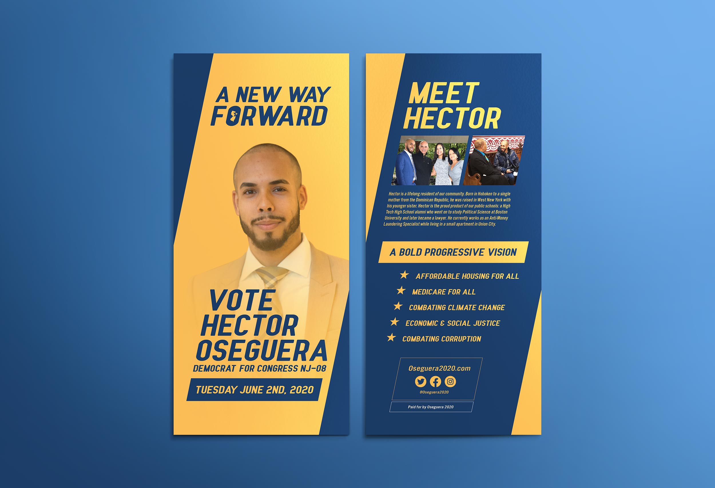 Inspired by the colors of New Jersey State, Oseguera's color palette consists of a combination of blue, yellow, red, and white. Embracing colors that embody his policy principles, splashes of color were used throughout the identity to represent unity, trust, excitement, strength, and energy for the people of District 8.