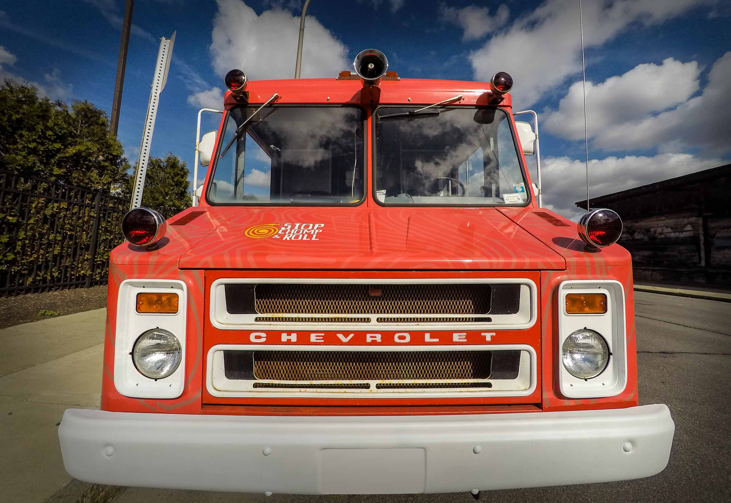 In order to create an eye-catching fiery smoke effect, pen and ink illustration techniques were used throughout the vinyl vehicle wrap. Diamond plate metal was attached to the skirt of the truck, while a metal ladder was repurposed to create a collapsible cafeteria-style tray table on the passenger side.