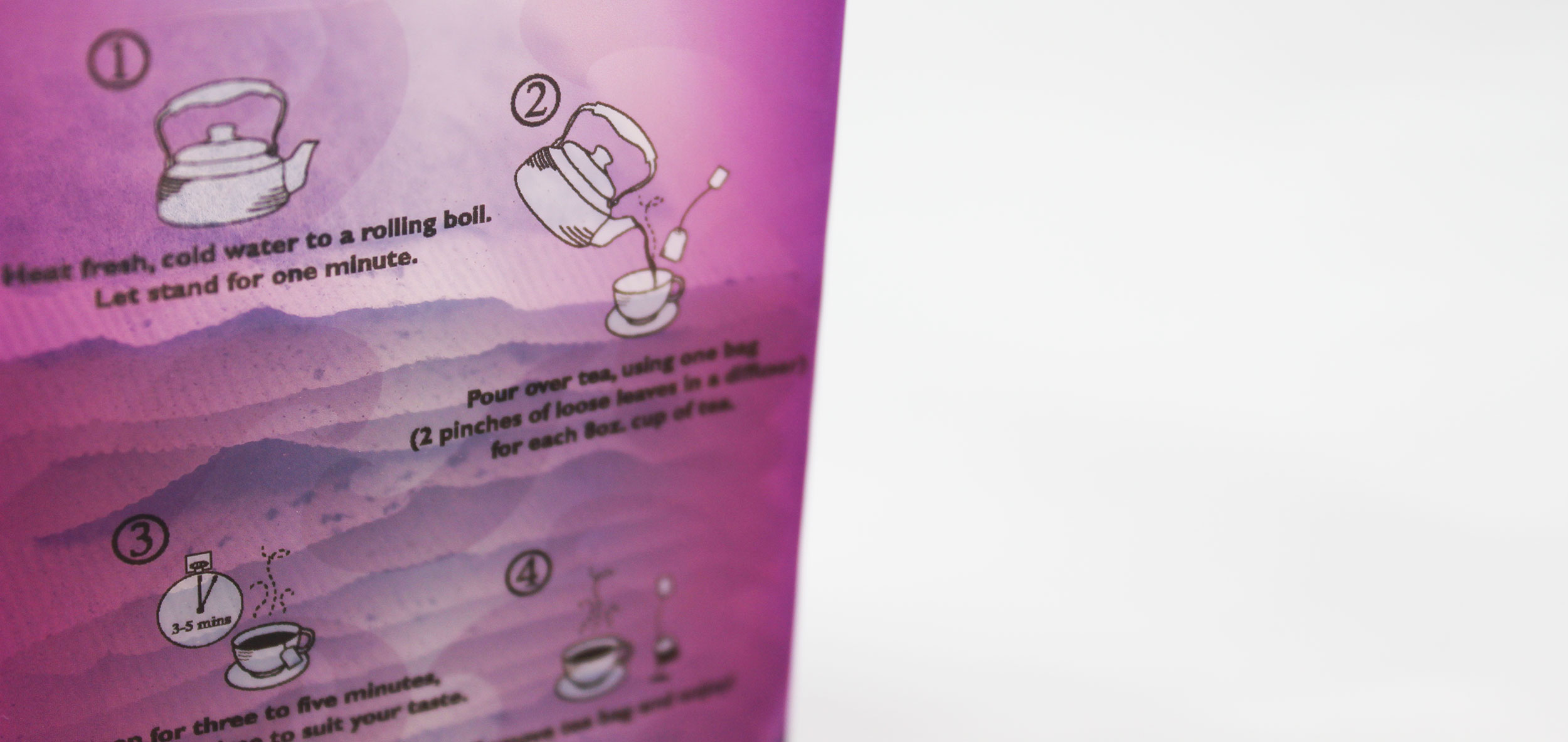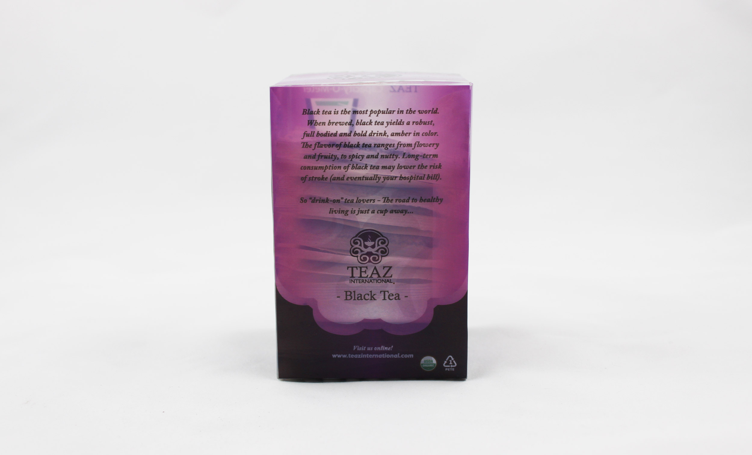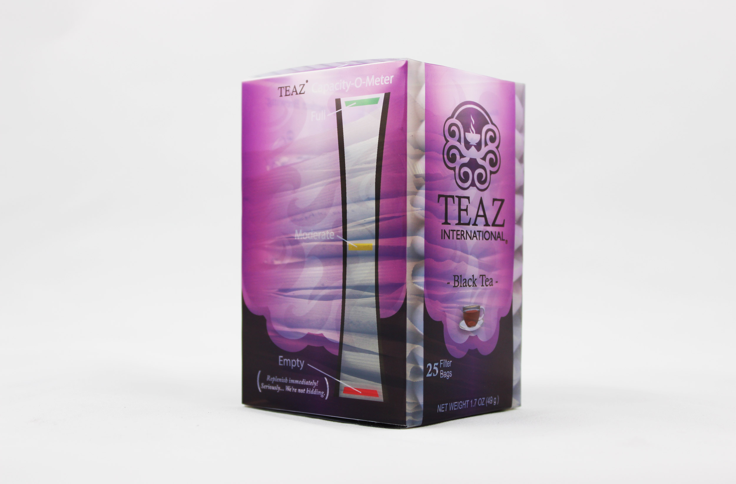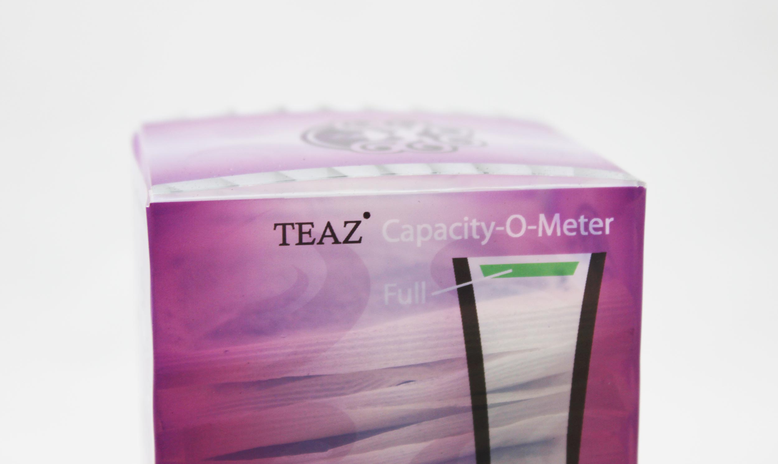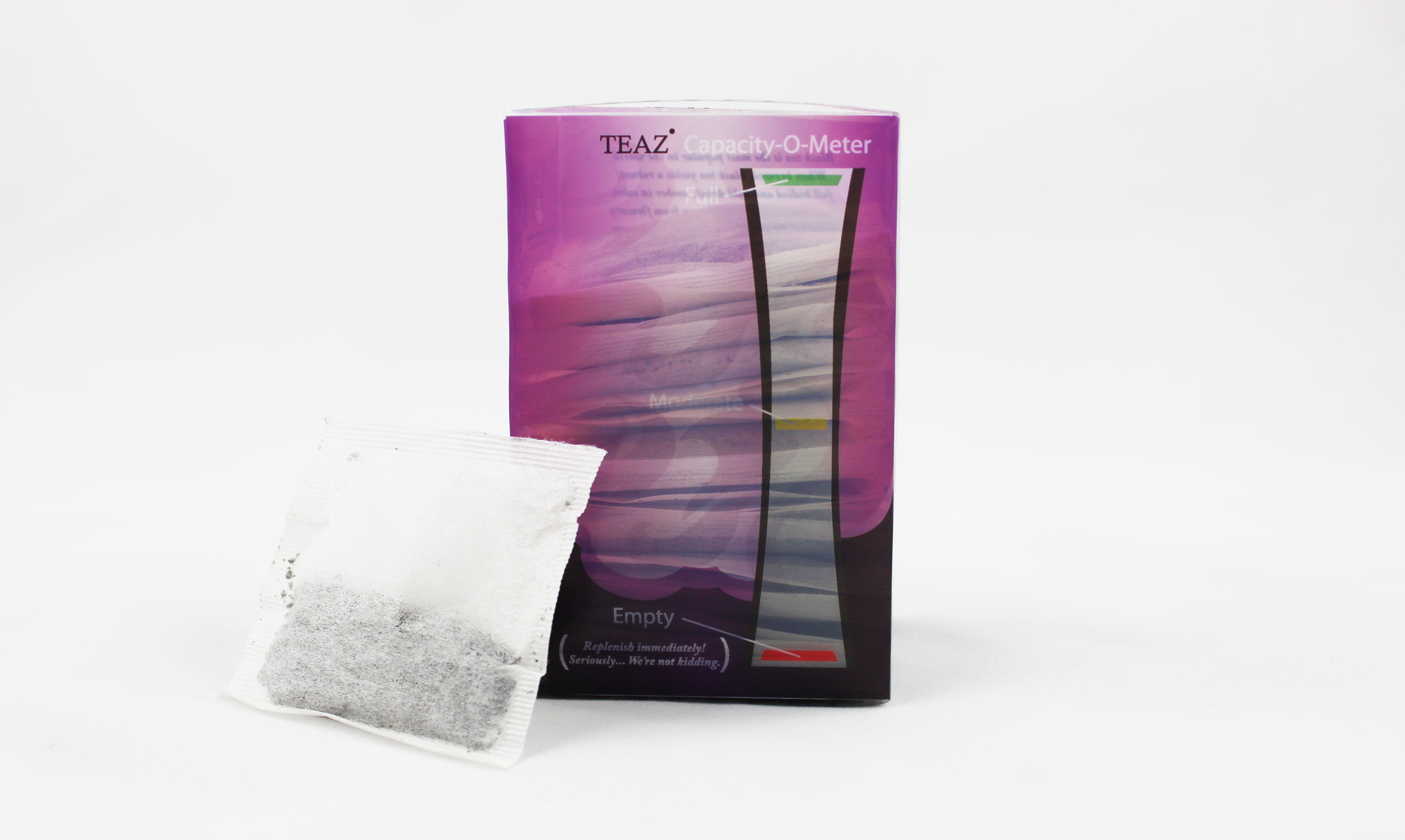 In order to create an interactive style of branding, custom transparent plastic was used for the entire package. In addition, the Teaz Capacity-O-Meter was developed to be a fun novelty to tell the consumer when their quantity of tea becomes too low.